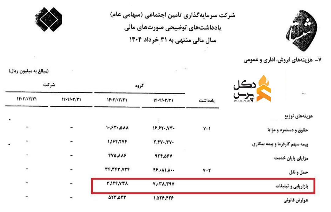 صورتهای مالی تازه منتشرشدهی گروه سرمایهگذاری تأمین اجتماعی (شستا) نشان میدهد که این مجموعه در سال گذشته بیش از ۷۰۴ میلیارد تومان برای تبلیغات و بازاریابی هزینه کرده است؛ رقمی که نسبت به سال ۱۴۰۲ با رشد بیش از ۲.۲ برابری همراه بوده است